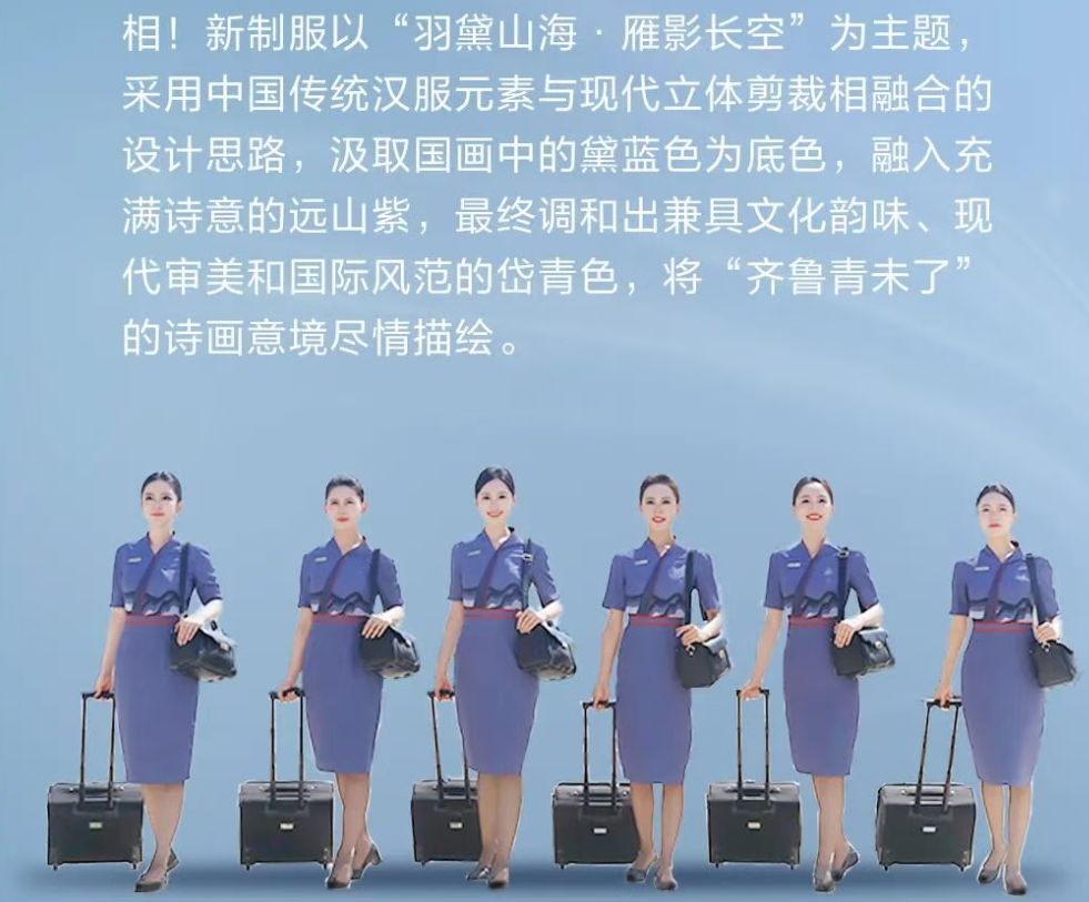 据了解,山东航空新制服“青未了”不仅融合了中国传统汉服元素,还遵循空乘实际需求与舒适体验,女空乘可自选裤装或过膝裙,轻便的平底鞋代替了以往的高跟鞋。