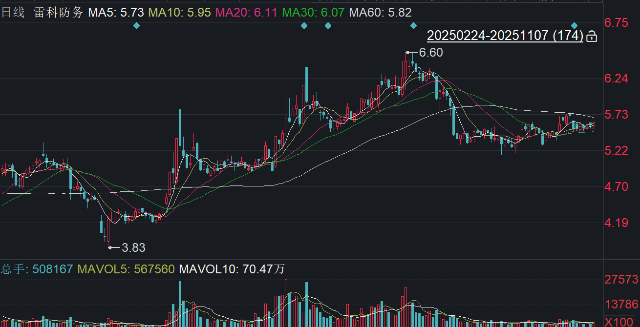 二级市场上,截至11月7日收盘,雷科防务上涨0.72%报5.60元/股,总市值约73.75亿元,今年来公司股价累计上涨近三成。
