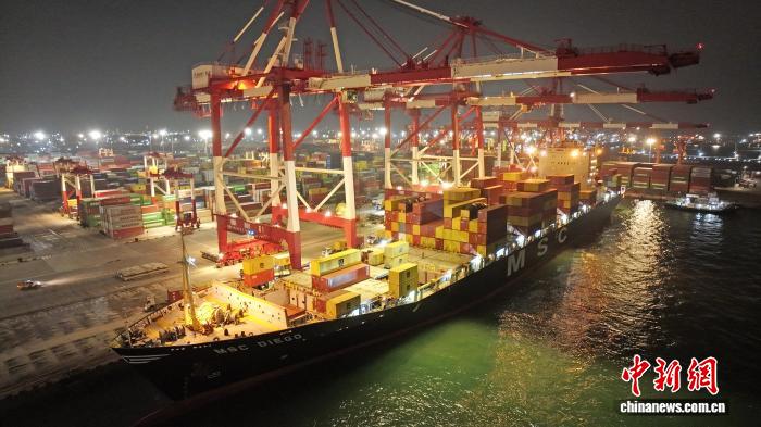 11月7日晚,地中海东南亚航线首班船舶“地中海迪亚哥”轮靠泊青岛港前湾集装箱码头。(无人机照片)侯方超摄