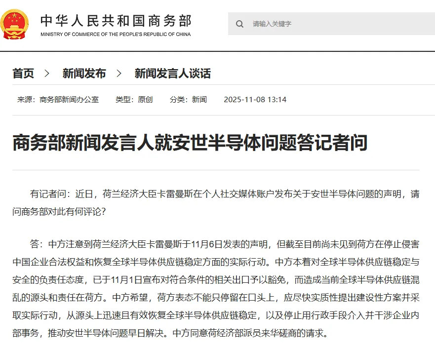 商务部就安世半导体问题答问:荷方表态不能只停留在口头上,中方同意荷经济部派员来华磋商的请求