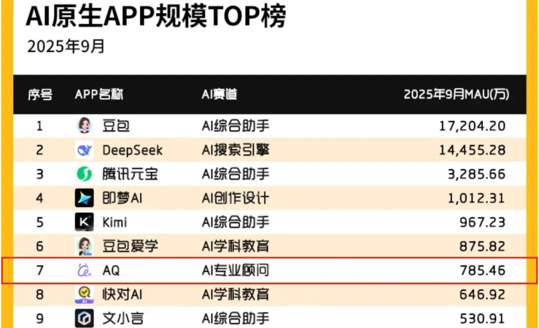 第一,自6月推出独立app后,AQ的用户正快速增长,成为中国首个月活突破千万的行业AI专业级应用,升至中国AI原生应用榜第7位。