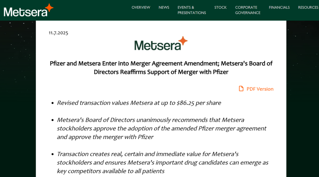 【导读】辉瑞与Metsera达成合并协议修正案,修订后交易对Metsera估值高达每股86.25美元