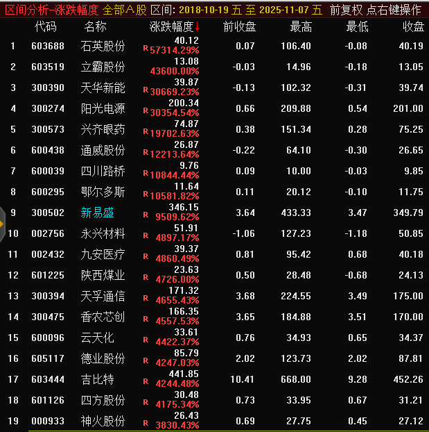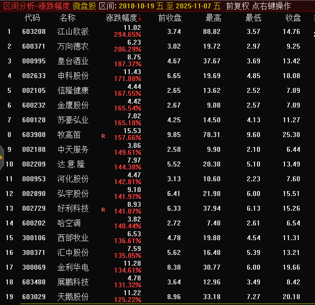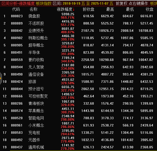 通达信数据显示,截至本周五(11月7日),微盘股指数最高达到了6629.42点。而2018年10月19日政策面全力纾困小微民企时,微盘股指数最低才604.67点。换言之,微盘股指数7年多来最大涨幅达996.37%接近10倍,位居同期A股各类板块风格概念涨幅第1名。