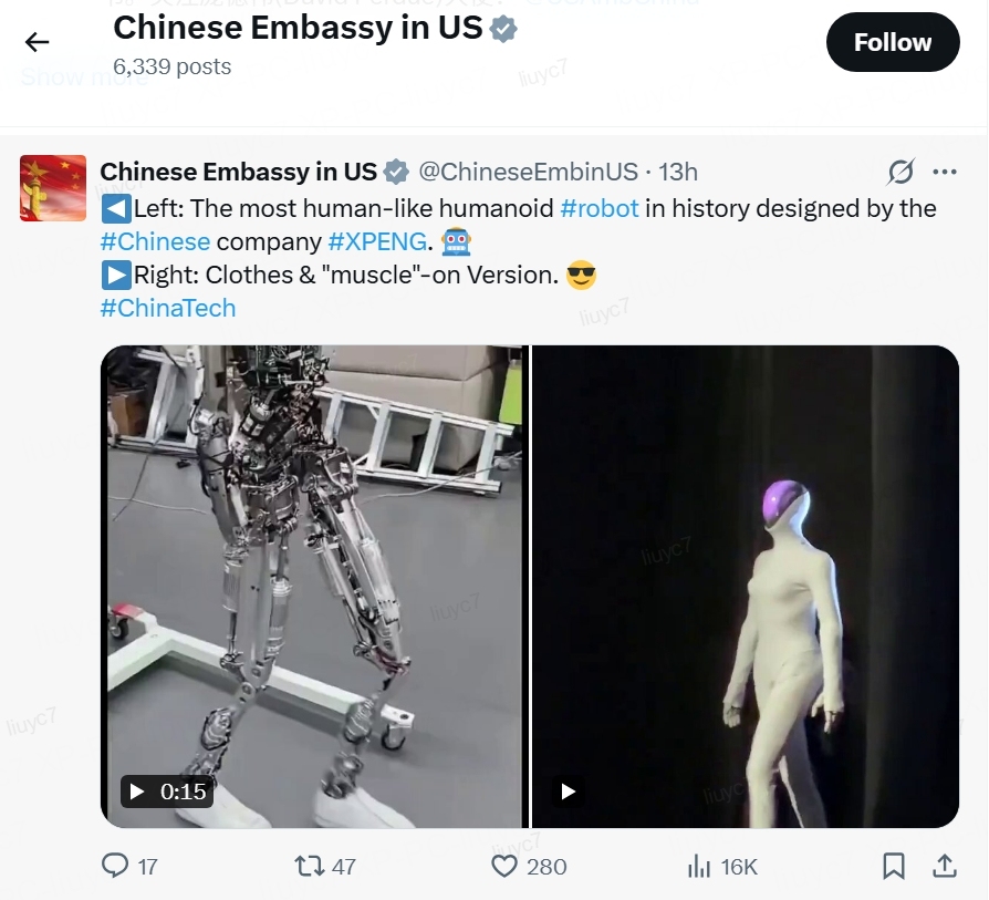 值得一提的是,国际科技巨头特斯拉的CEO埃隆·马斯克,在通过国际媒体Pandaily得知小鹏IRON机器人后,也隔空与何小鹏对话,称“特斯拉和中国公司将主导市场。我非常尊重中国的竞争对手,中国有很多聪明、勤奋的人”。而中国驻美大使馆同样转发了小鹏的人形机器人视频,足以见得这项超前技术已经获得了从上到下的多方关注与认可。