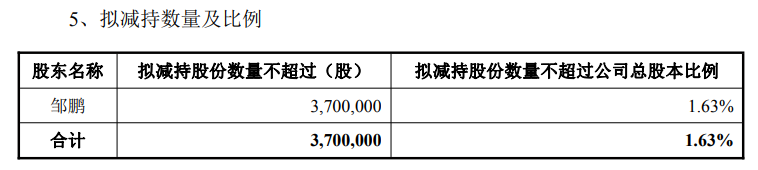 公告介绍,公司于近日收到公司副董事长、总经理邹鹏《关于减持公司股票计划告知函》的通知,邹鹏目前持有公司股份14,985,545股,占公司总股本的6.61%。因个人资金需求,邹鹏计划在本公告披露之日起15个交易日后三个月内(即2025年12月1日至2026年2月27日,窗口期不减持),通过证券交易所集中竞价、大宗交易等方式减持公司股份合计不超过370万股,占公司总股本的1.63%。减持价格根据减持时的市场价格确定。