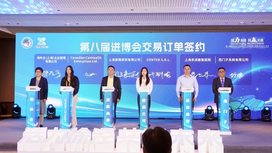 进博会采购订单签约环节,上海崇雅商贸有限公司与康黛公司(CONTER SRL)、上海禾滨康复医院与西门子系统有限公司、海外仓(上海)企业管理有限公司与CanHealth Enterprises Ltd.采供双方企业代表现场签署进博会交易订单。本届进博会徐泾镇累计达成意向订单850万美元。