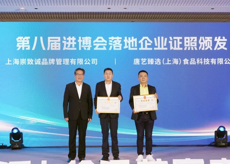 活动现场,上海崇致诚品牌管理有限公司、唐艺臻选(上海)食品科技有限公司、极光之桥(上海)文化传媒有限公司、上海金占芭茶业有限公司,以及上海之羽函贸易有限公司等 5 家企业在第八届进博会期间正式落户徐泾,成为“徐泾合伙人”, 获颁“新鲜出炉”的营业证照。