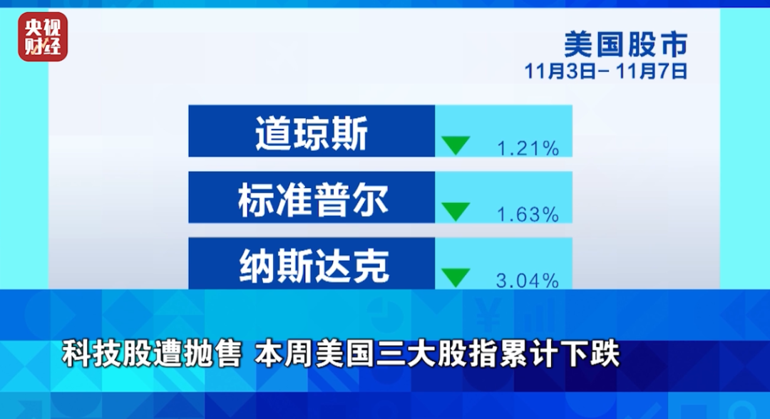 本周,投资者开始质疑人工智能板块泡沫化风险与盈利能力,全球股市科技股出现抛售潮,多家大型投行和金融机构称美股未来面临大幅回调风险,加剧股市下行压力,科技股和芯片股领跌,人工智能龙头股多日表现低迷,本周美国三大股指集体下跌,其中道指跌1.21%,标普500指数下跌1.63%,纳指下跌3.04%。