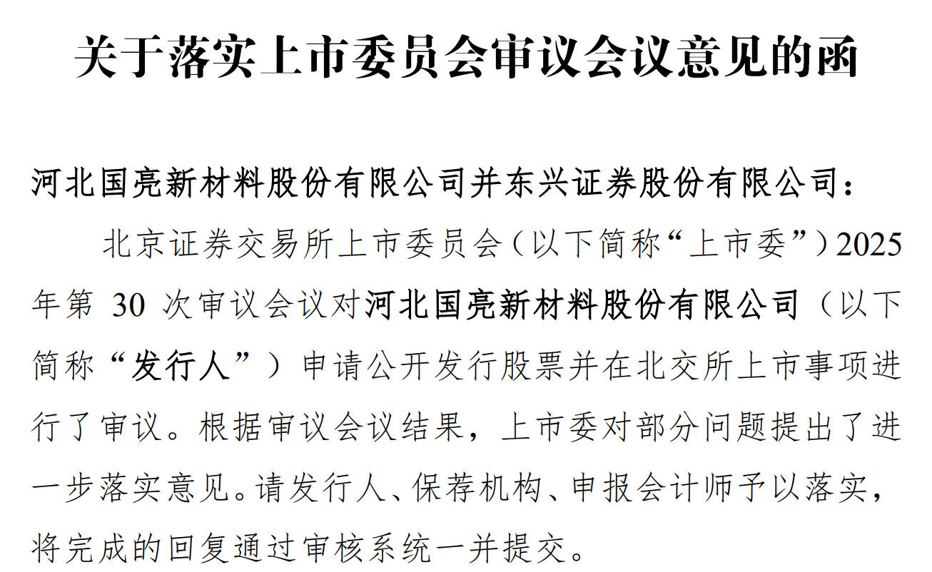 11月7日,北京证券交易所上市委员会(下称“上市委”)下发《关于落实上市委员会审议会议意见的函》,要求河北国亮新材料股份有限公司(简称“国亮新材”)及其保荐机构东兴证券、申报会计师就2024年下半年收入、毛利率异常波动以及货币资金收益匹配性两大问题作出书面说明,并按时提交回复。这意味着该公司北交所IPO进程暂时止步,需先化解监管层的上述疑虑。