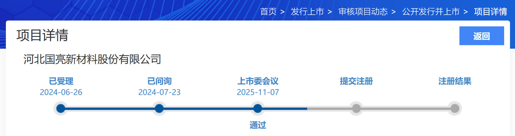 据查,国亮新材于2024年6月26日上市材料获得北交所受理,2025年1月完成首轮问询回复,2025年11月7日上会并获得“通过”结果。但按照注册制“问询-落实-注册”环节,公司仍需解决本次上市委提出的“落实意见”后方可进入证监会注册程序。