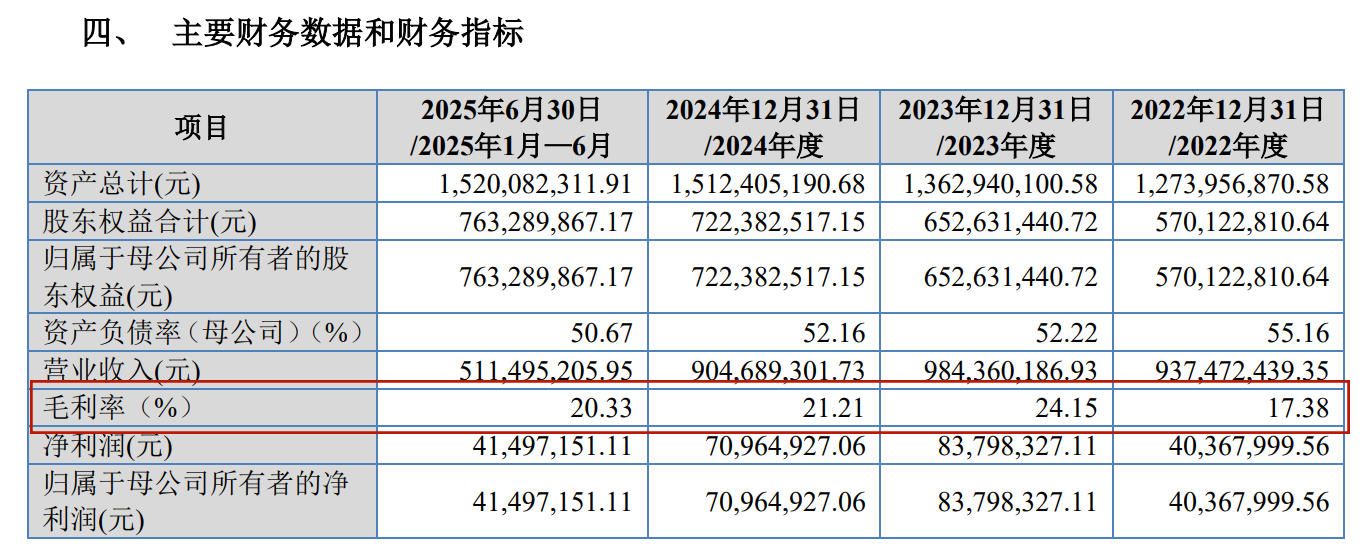 国亮新材的财务数据呈现出明显波动性。2022年至2025年6月,公司营业收入分别为9.37亿元、9.84亿元、9.05亿元和5.11亿元,净利润分别为4036.80万元、8379.83万元、7096.49万元和4149.72万元。2024年,受下游钢铁行业市场低迷的影响,公司营业收入较上年同期下降7967.09万元,降幅为8.09%,净利润较上年同期下降1283.34万元,降幅达15.31%。