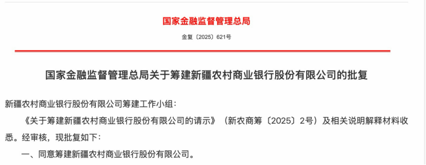 11月7日,国家金融监督管理总局发布批复显示,监管已同意筹建新疆农村商业银行(以下简称“新疆农商银行”)。