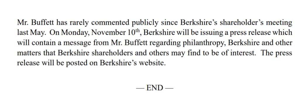 沃伦·巴菲特旗下公司伯克希尔-哈撒韦在日前发布的一则澄清声明中透露,11月10日(周一),伯克希尔将发布一份新闻稿,其中包含巴菲特就慈善事业、伯克希尔公司,以及其他伯克希尔股东和相关人士可能感兴趣的相关事项的声明。该新闻稿将在伯克希尔公司官方网站上发布。