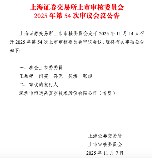 上交所网站披露,2025年11月14日(周五),上交所上市委将审议深圳市恒运昌真空技术股份有限公司(以下简称“恒运昌”)科创板IPO项目。恒运昌于2025年6月13日申报科创板IPO,保荐机构为中信证券。