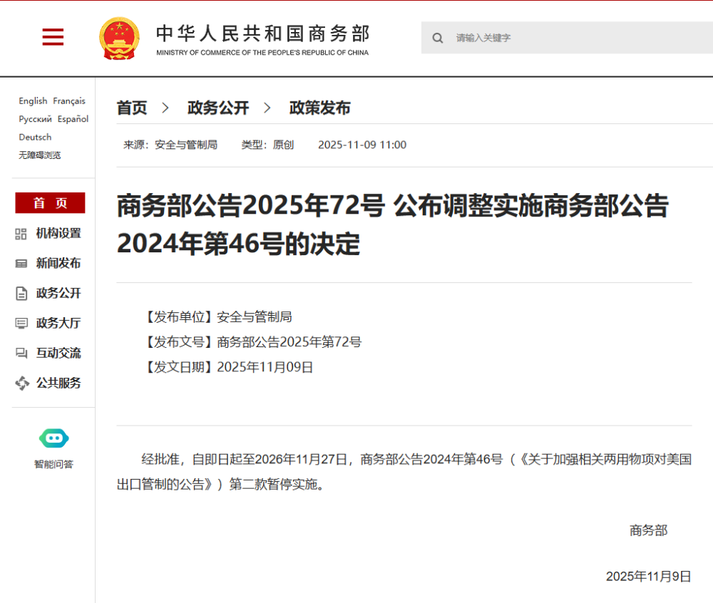 经批准,自即日起至2026年11月27日,商务部公告2024年第46号(《关于加强相关两用物项对美国出口管制的公告》)第二款暂停实施。
