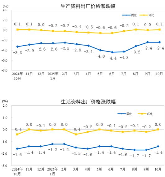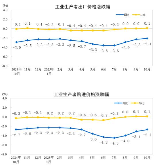 中新网11月9日电据国家统计局网站消息,2025年10月份,全国工业生产者出厂价格同比下降2.1%,降幅比上月收窄0.2个百分点;环比由上月持平转为上涨0.1%。工业生产者购进价格同比下降2.7%,降幅比上月收窄0.4个百分点;环比上涨0.1%,涨幅与上月相同。1—10月平均,工业生产者出厂价格比上年同期下降2.7%,工业生产者购进价格下降3.2%。