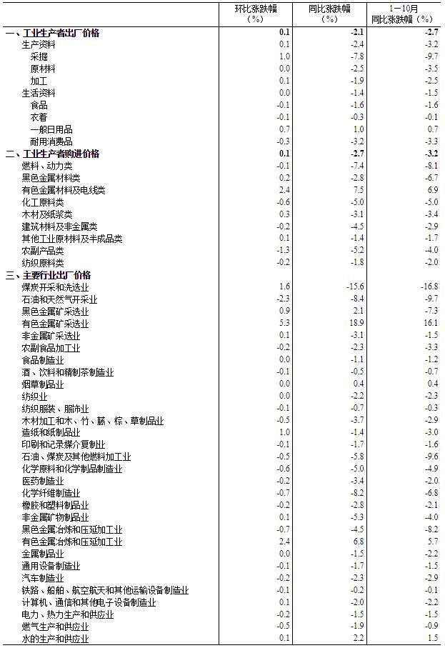 10月份,工业生产者出厂价格中,生产资料价格上涨0.1%,影响工业生产者出厂价格总水平上涨约0.08个百分点。其中,采掘工业价格上涨1.0%,原材料工业价格持平,加工工业价格上涨0.1%。生活资料价格持平。其中,食品、衣着价格均下降0.1%,一般日用品价格上涨0.7%,耐用消费品价格下降0.3%。
