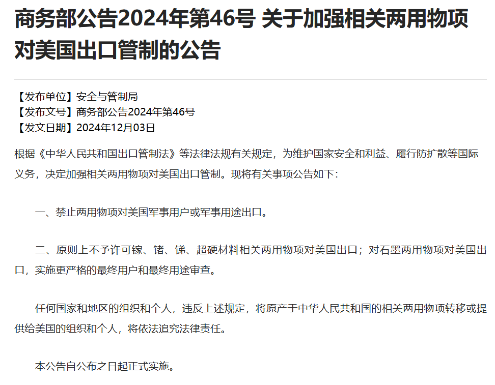 据了解,商务部公告2024年第46号(《关于加强相关两用物项对美国出口管制的公告》)第二款内容为“原则上不予许可镓、锗、锑、超硬材料相关两用物项对美国出口;对石墨两用物项对美国出口,实施更严格的最终用户和最终用途审查”。