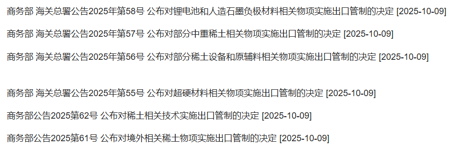 更早之前,11月7日,商务部、海关总署联合公告,经批准,自即日起至2026年11月10日,商务部、海关总署公告2025年第55号、56号、57号、58号,及商务部公告2025年第61号、62号暂停实施。相关公告涉及锂电池、人造石墨负极材料、稀土等相关物项。