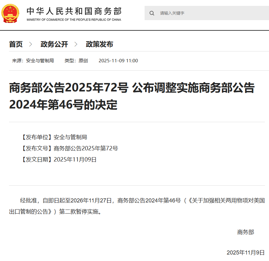 11月9日,商务部发布公告,公布调整实施商务部公告2024年第46号的决定:经批准,自即日起至2026年11月27日,商务部公告2024年第46号(《关于加强相关两用物项对美国出口管制的公告》)第二款暂停实施。
