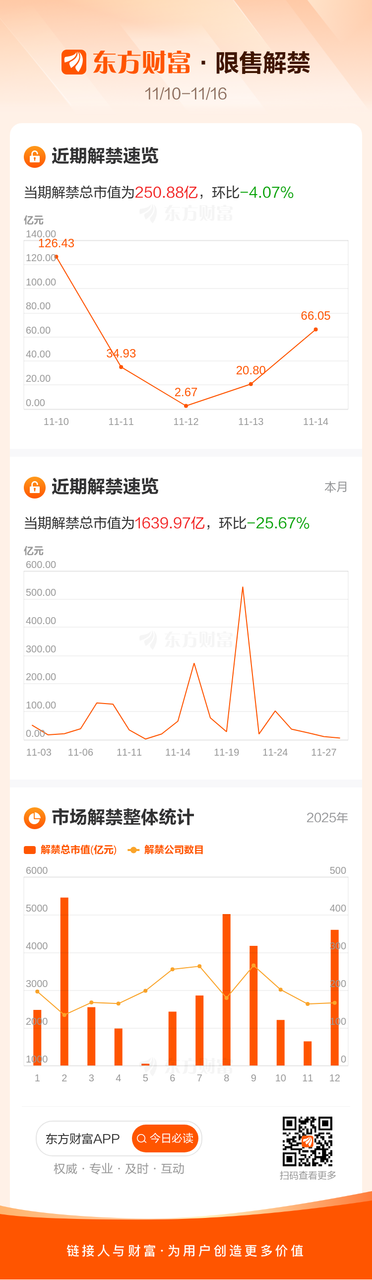 下周(11月10日至11月16日)有43家公司限售股陆续解禁,当期解禁总市值为250.88亿元,环比-4.07%。