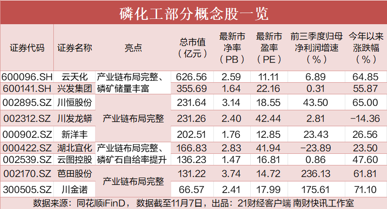 而在磷化工板块,21财经·南财快讯记者据同花顺iFinD统计,截至11月7日,今年磷化工板块已涨超49.41%,并诞生6只翻倍股,其中,天际股份涨超312%,兴福电子涨超209%。