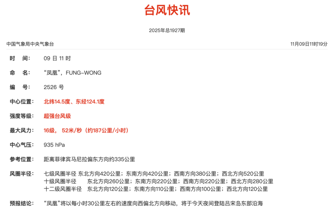今年第26号台风“凤凰”已于今天(9日)凌晨加强为超强台风级,今天11时位于距离菲律宾马尼拉偏东方向约335公里,中心附近最大风力有16级(52米/秒)。
