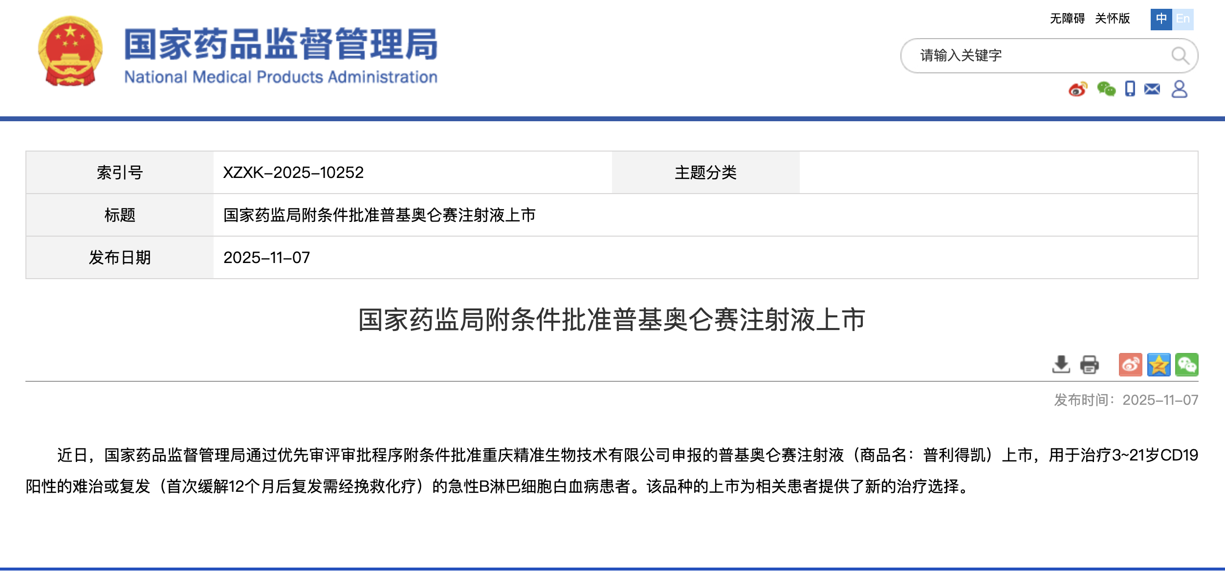 11月7日,重庆精准生物技术有限公司自主研发的国家一类生物新药“普基奥仑赛注射液”(商品名:普利得凯®)正式获得国家药品监督管理局(NMPA)批准上市。