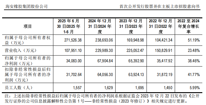 2022年至2024年及2025年上半年,海安集团的营业收入分别为15.08亿元、22.51亿元、23.00亿元及10.80亿元,归母净利润分别为3.54亿元、6.54亿元、6.79亿元及3.41亿元。