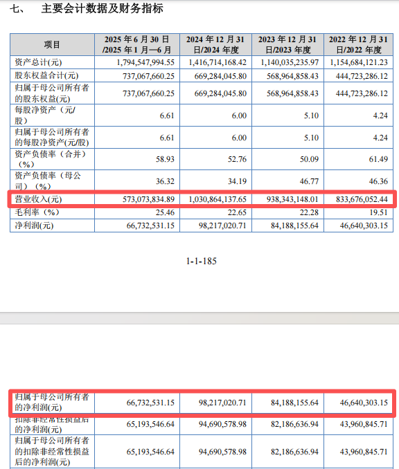 2022年至2024年及2025年上半年,南特科技的营业收入分别为8.34亿元、9.38亿元、10.31亿元及5.73亿元,归母净利润分别为4664.03万元、8418.82万元、9821.70万元及6673.25万元。