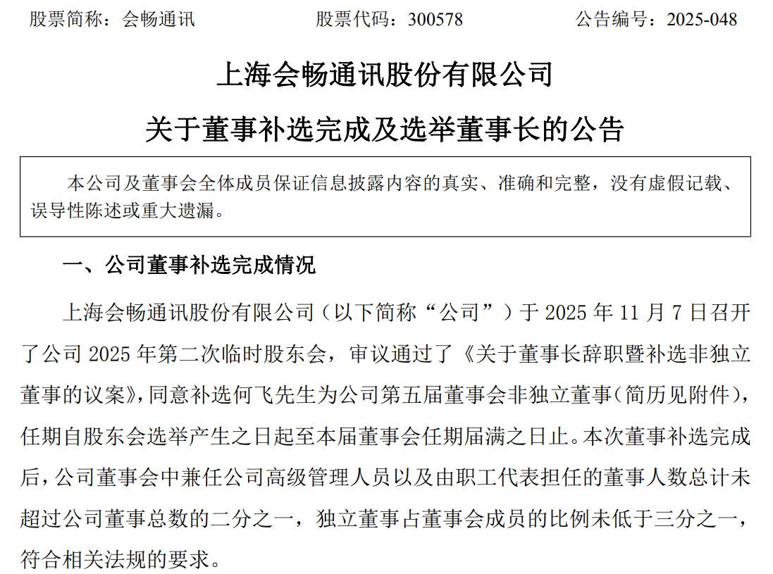 11月9日晚间,会畅通讯(300578)发布公告称,公司于2025年11月7日召开了2025年第二次临时股东会,审议通过了董事长辞职暨补选非独立董事的议案,补选何飞为公司第五届董事会非独立董事。同时,公司于11月7日召开第五届董事会第十三次会议,选举何飞担任公司新任董事长,任期自本次董事会审议通过之日起至第五届董事会任期届满日止。值得一提的是,何飞与原董事长何其金为父子关系。