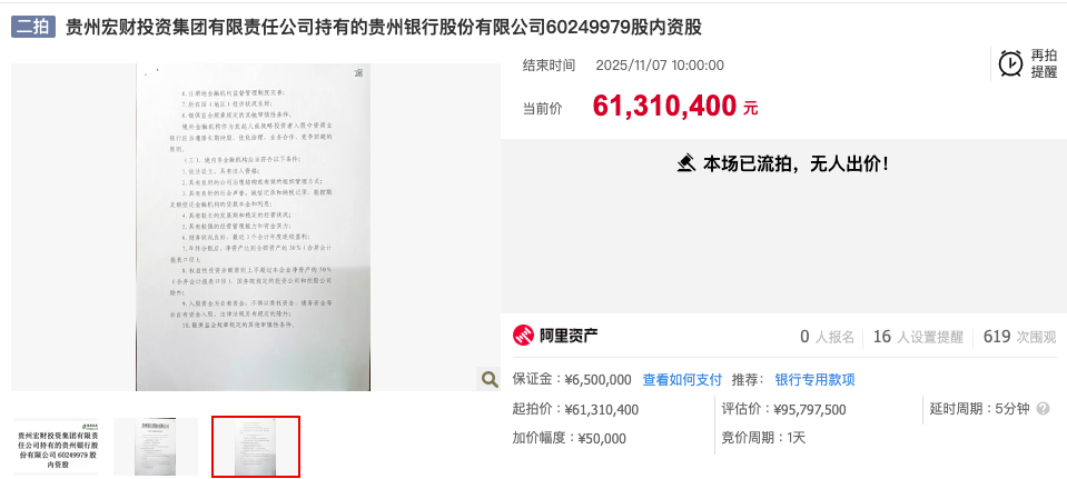 此前,11月6日上午10时,另外一笔约6025万股贵州银行股权在阿里资产交易平台正式开拍,起拍价为6134.04万元,评估价为9579.75万元( 1.59元/股),其首次拍卖的起拍价为7663.8万元(折合每股约1.27元)。尽管起拍价较首次已下调20%,但二次拍卖仍无人问津而流拍。