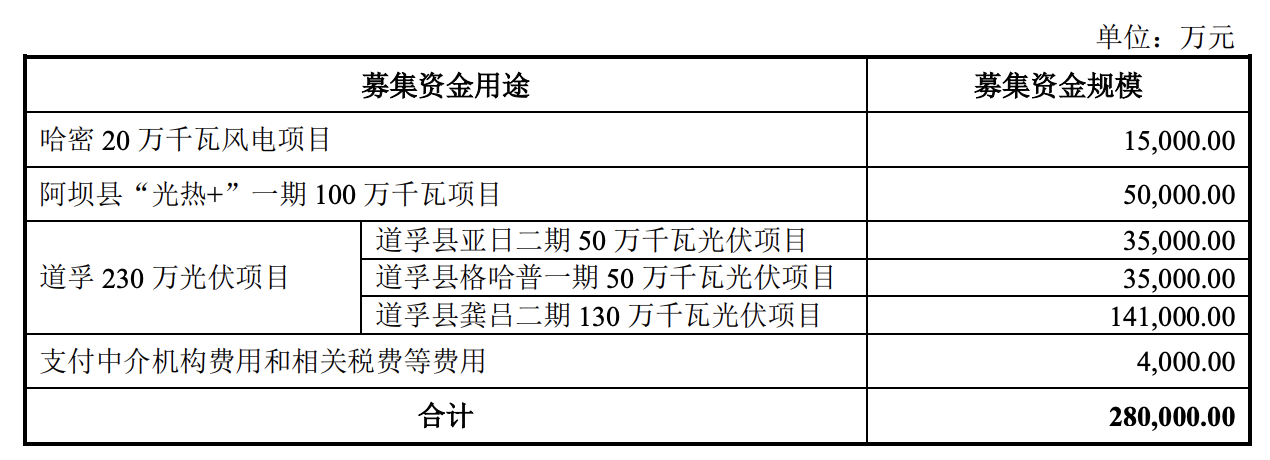 对于募集配套资金安排,草案显示,拟发行股份不超过28亿元用于哈密20万千瓦风电项目、阿坝县“光热+”一期100万千瓦项目、道孚230万光伏项目、及支付中介机构费用和相关税费等费用。