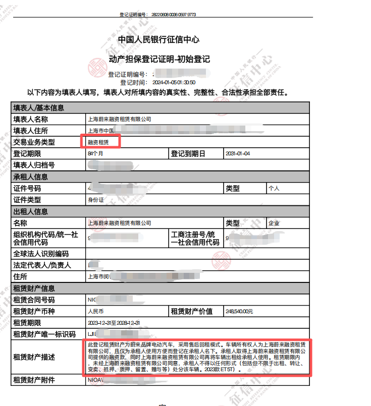 在中国人民银行征信中心动产担保登记证明上写着,该车辆的所有权人为上海蔚来融资租赁有限公司,租金计算方式为等额租金法,共60期。