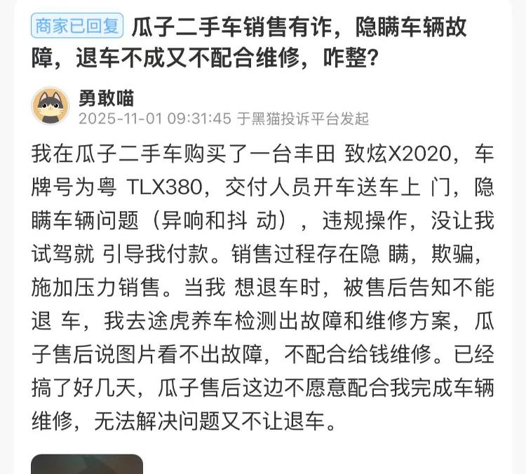 消费者在黑猫投诉平台上对瓜子二手车的投诉内容