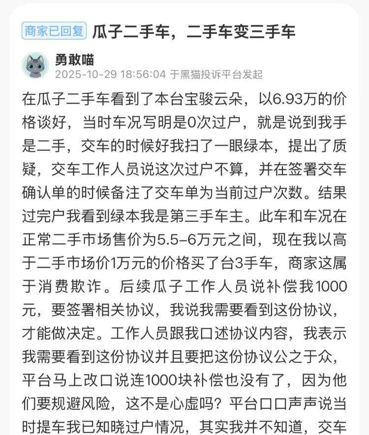 记者注意到,金女士的遭遇很可能并非个例。在黑猫投诉平台上,关于瓜子二手车的投诉量超5000条,投诉内容集中在涉骗、不予退款、客服不处理等。也不少消费者在社交平台反映,平台宣传的 “无调表车、无泡水车”“问题车包赔”等承诺难以兑现。一位消费者在黑猫投诉平台分享到“交付人员送车上门后,隐瞒车辆问题(异响和抖动),没试驾就让我付款”“车辆详情写着0过户,但绿本上已有一次过户信息,承诺不曝光补偿1000元私了,但只有口头约定没有书面协议……”