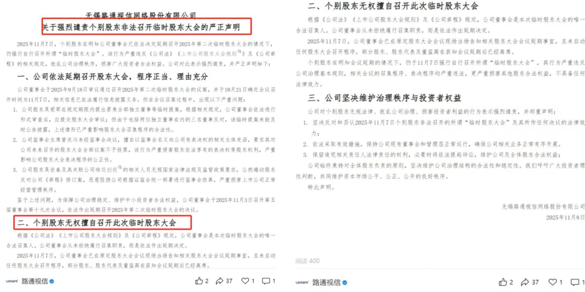 11月9日0点39分,路通视信微信公众号发文称:“2025年11月7日,个别股东在明知公司董事会已依法决定延期召开2025年第二次临时股东大会的情况下,仍强行自行召开所谓‘临时股东大会’。该行为严重违反《中华人民共和国公司法》《上市公司股东大会规则》及《公司章程》的相关规定,扰乱公司治理秩序,损害广大投资者合法权益。公司对此表示强烈谴责。”