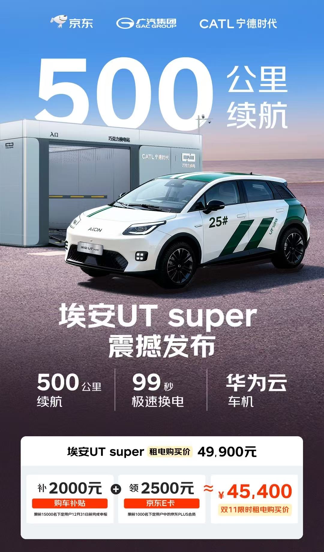 最低一辆车只要4.99万元。《中国经营报》记者获悉,11月9日,京东联合广汽集团、宁德时代共同生产的“国民好车”埃安UT super正式开售。其中电池租用购车价为4.99万元,整车购买价为8.99万元。