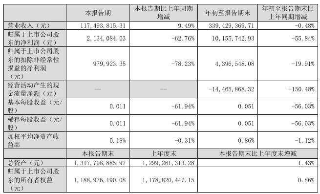 业绩方面,会畅通讯第三季度实现营业收入1.17亿元,同比增长9.49%;净利润213.41万元,同比下降62.76%。