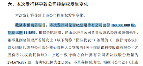 目前,维信诺无控股股东、无实际控制人;若本次发行完成,公司控股股东将变更为合肥建曙,公司实际控制人将变更为合肥市蜀山区人民政府。该事项尚需取得相关部门批准。公司股票自11月10日(星期一)开市起复牌。