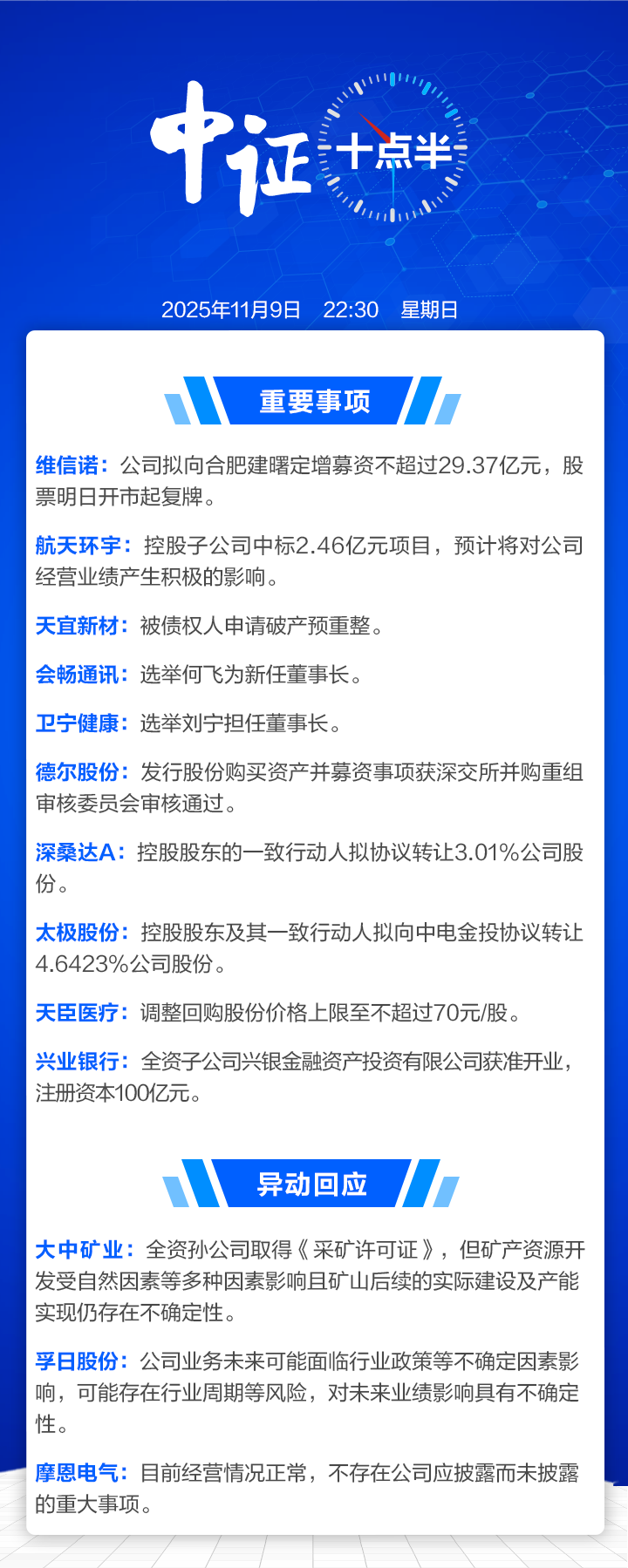 【中证十点半】维信诺拟定增募资不超过29.37亿元,股票复牌;深桑达A、太极股份拟协议转让公司股份