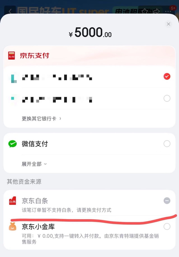 蓝鲸汽车记者在京东APP搜索“国民好车”后,目前有两个选项可选:支付5千元定车(下定锁单不可退)、支付500元意向金预约试驾(可退)。