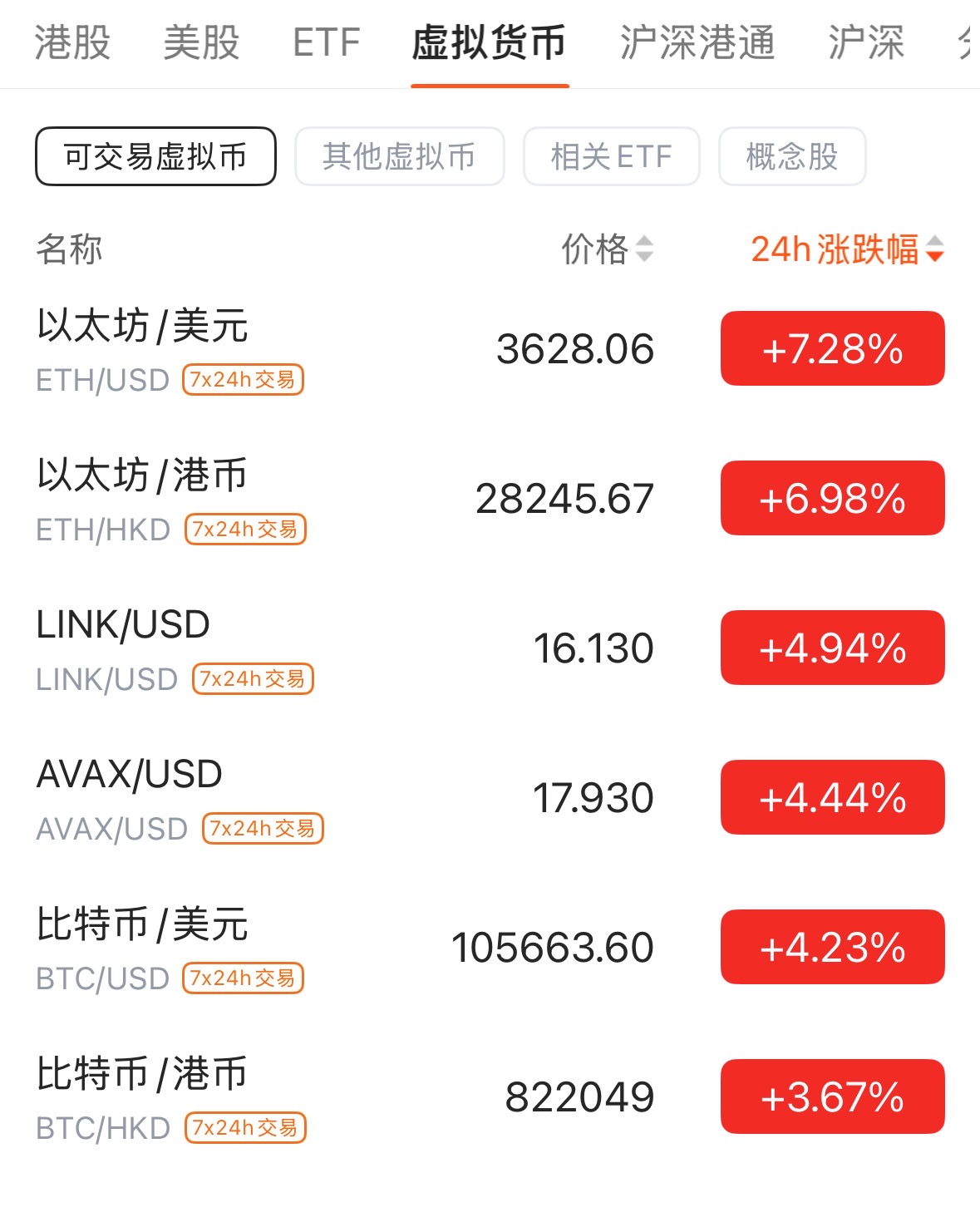 加密货币市场弹性更大, 比特币 (BTC.CC) 一度升破106000美元, 以太坊 (ETH.CC) 一度升破3600美元。