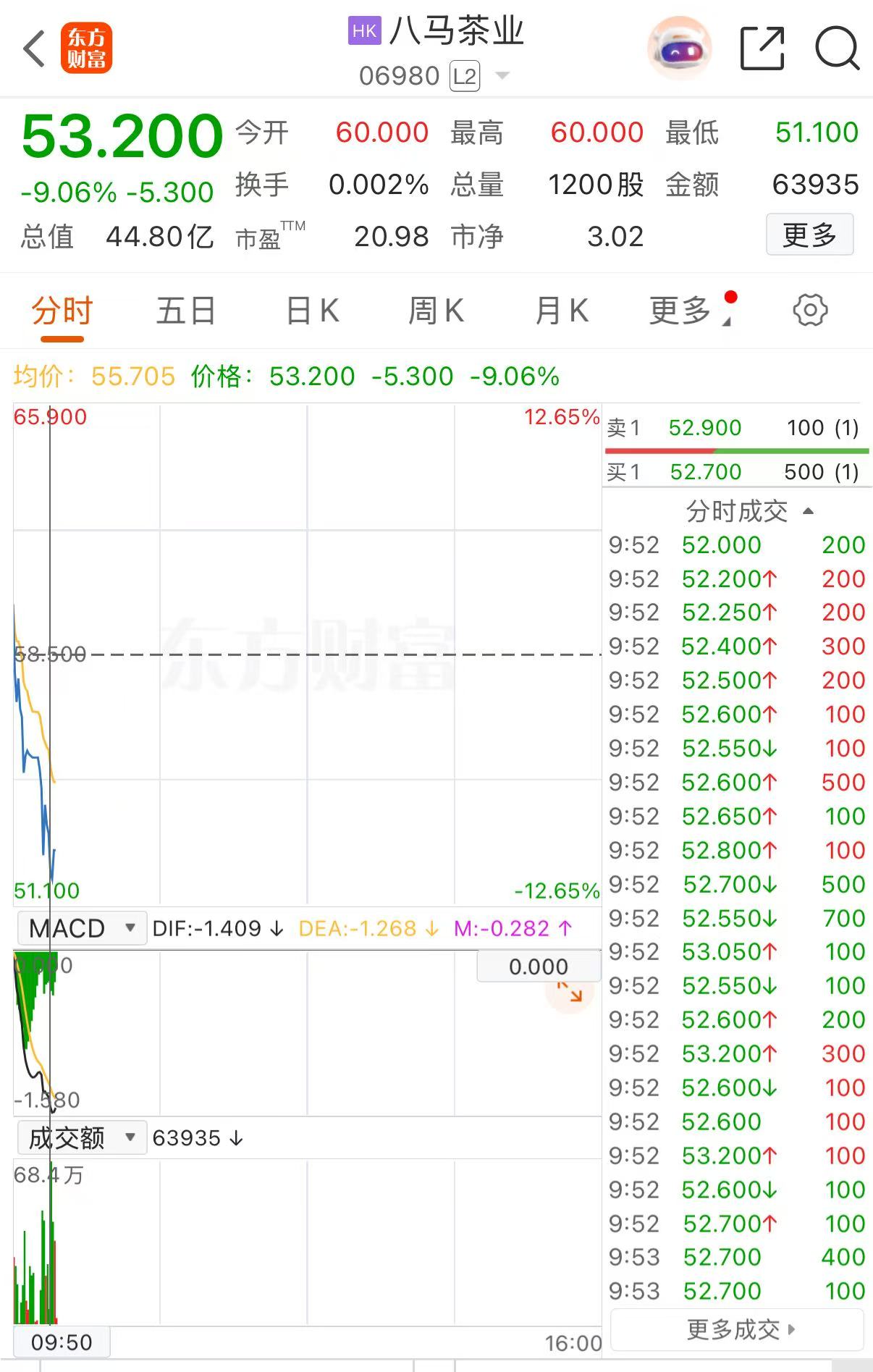 上证报中国证券网讯(记者孔令仪)11月10日,八马茶业继续下行,最低报51.1港元/股,逼近其上市发行价,跌幅超12%。截至9点50分,八马茶业跌9.06%,报53.2港元/股,总市值缩水至约44.8亿港元。