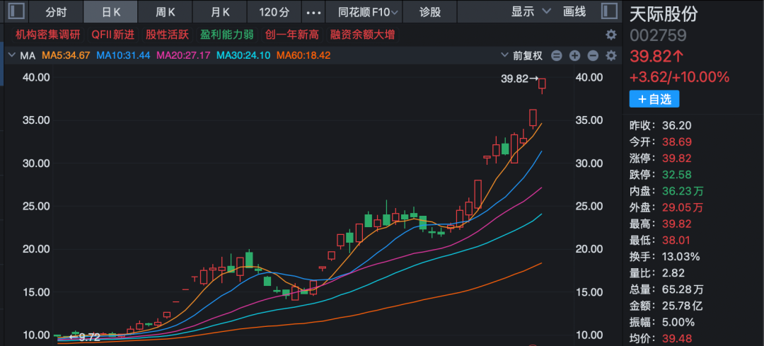 盘初,锂电池板块走强,电解液、磷酸铁锂方向领涨,天际股份2连板,此前深圳新星、孚日股份3连板,华盛锂电、芳源股份、海科新源、多氟多、永太科技、天华新能、大中矿业、丰元股份等涨幅靠前。