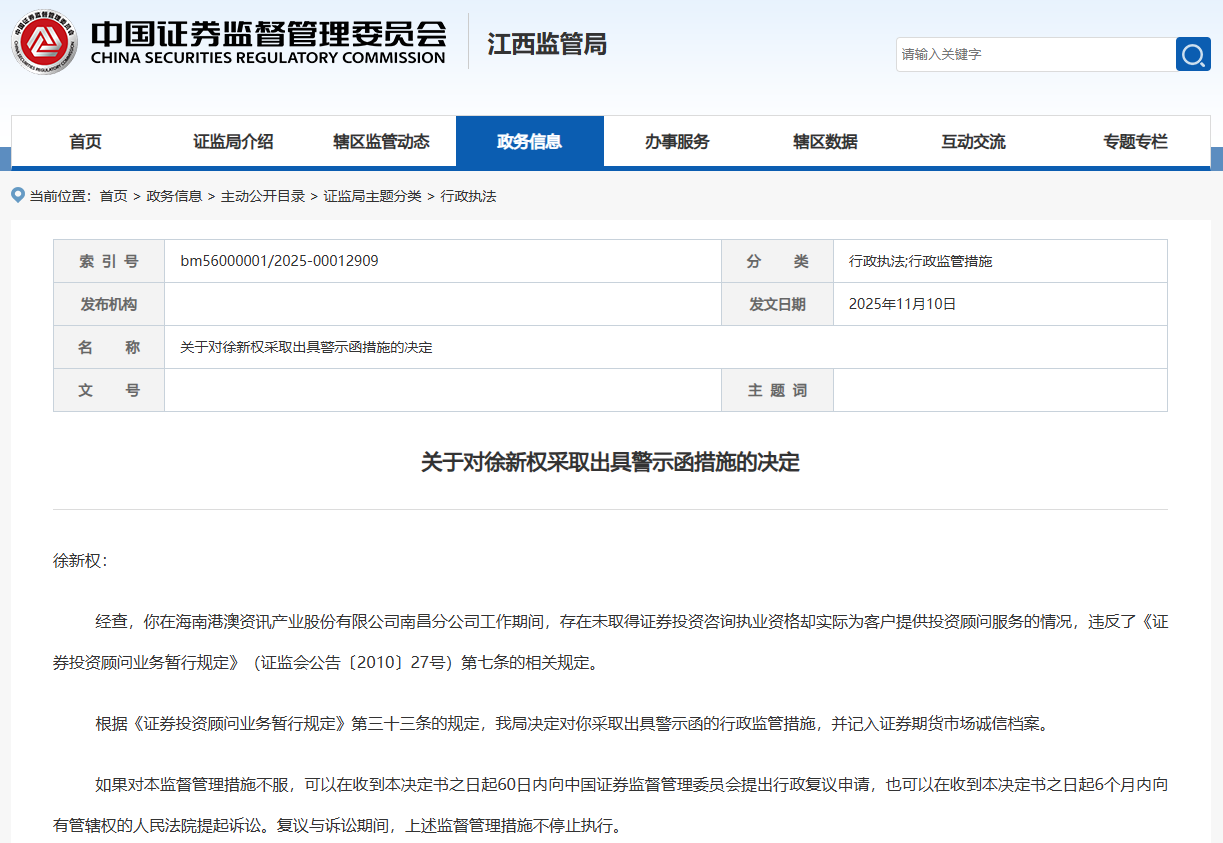 江西证监局11月10发布公告,对海南港澳资讯产业股份有限公司南昌分公司及徐新权出具警示函。