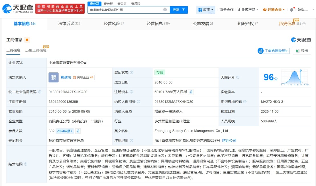 南方财经11月10日电,天眼查App显示,近日,中通供应链管理有限公司发生工商变更,新增BytedancePte.Ltd.、TAOBAOCHINAHOLDINGLIMITED等为股东,同时注册资本由4.2亿人民币增至约6亿人民币,增幅约43%。该公司成立于2016年5月,法定代表人为赖建法,经营范围含供应链管理服务、企业管理、普通货物仓储服务等。股东信息显示,该公司由赖建法、赖梅松及上述新增股东等共同出资。