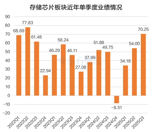 此外,在涨价潮背景下,存储芯片板块的业绩也大幅改善。东方财富Choice数据显示,今年前三季度,存储芯片板块合计实现归母净利润155.02亿元,同比增长14.32%。其中第三季度,存储芯片板块合计实现归母净利润70.25亿元,同比增长40.21%,环比增长30.09%。