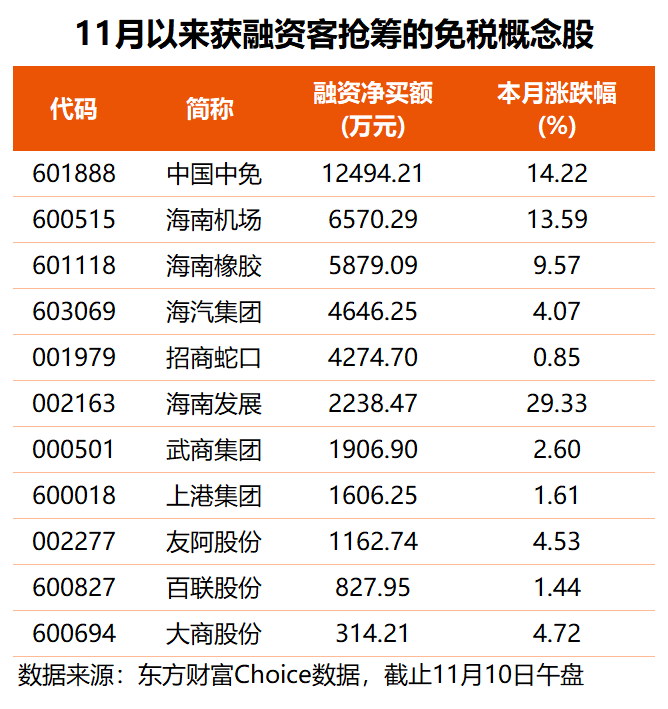 值得注意的是,东方财富Choice数据显示,11月以来,多只免税概念股获得杠杆资金加仓,其中,中国中免月内获融资客抢筹约1.25亿元,海南机场、海南橡胶融资净买额均超5000万元。