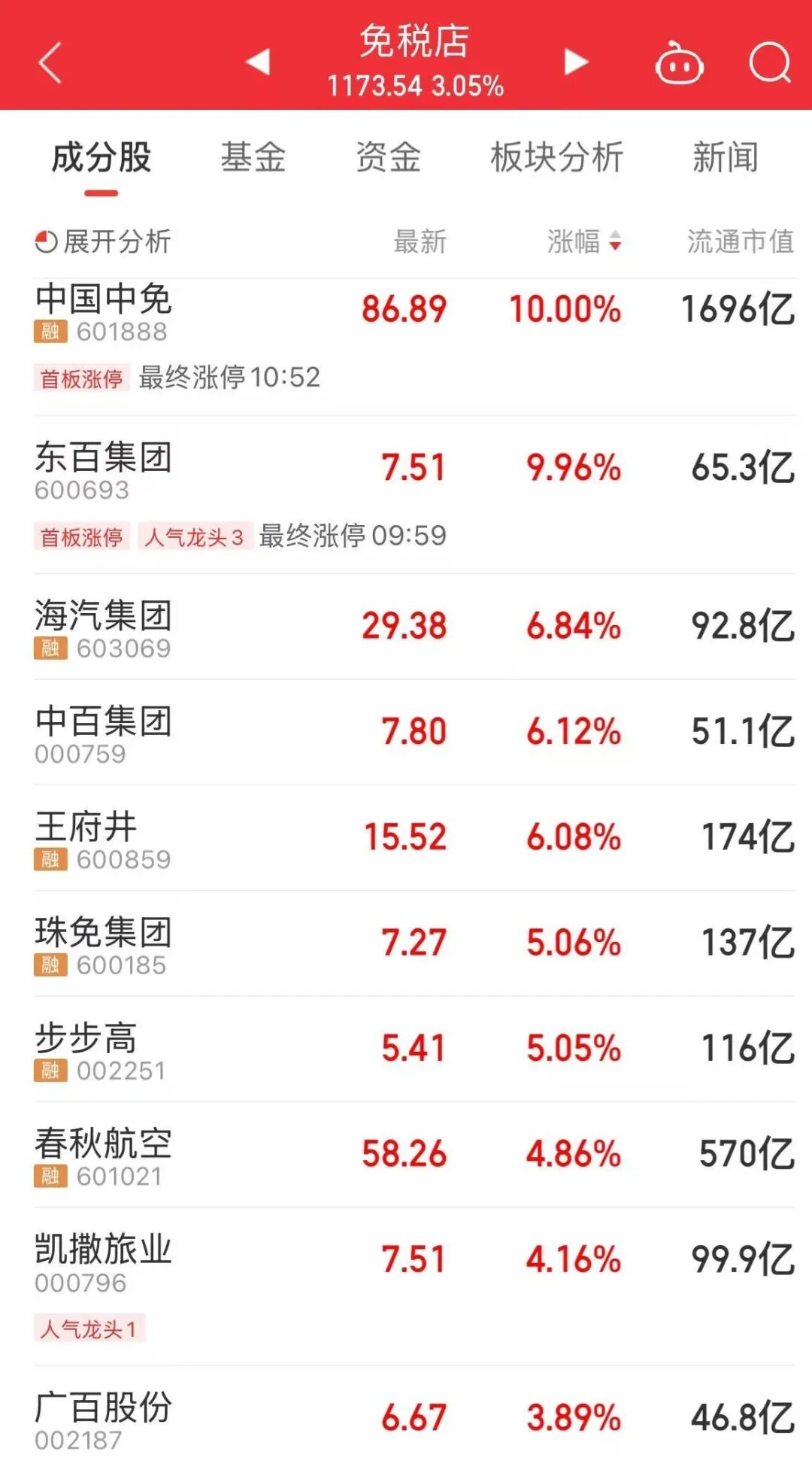 今天上午,大消费上涨,免税店板块大涨,龙头股中国中免涨停。